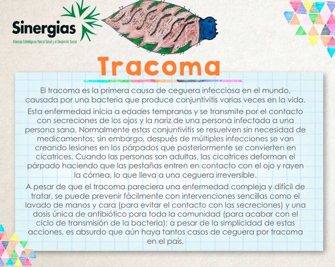 Desde marzo de 2017, Sinergias trabaja en el departamento de Guainía para mejorar la cobertura para la prevención, control y eliminación de 6 enfermedades infecciosas: tracoma, geohelmintiasis, escabiosis, tungiasis, pediculosis y síndrome de larva migratoria, todas altamente prevalentes en la región pero que históricamente han recibido poca atención por parte del sistema de salud; razón por la cual se les llama enfermedades desatendidas.